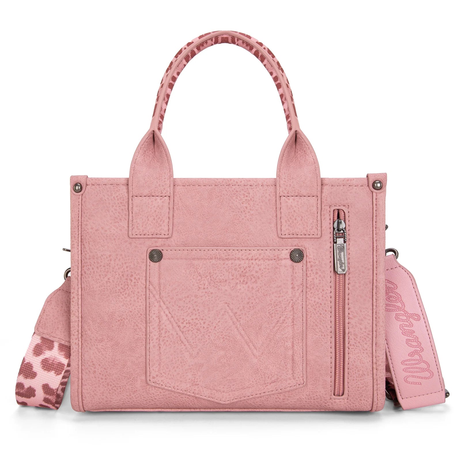 This pink Wrangler Leopard Print Tote features PU leather construction with whipstitched details and a bold Wrangler logo. It includes a hidden back zippered pocket for concealed carry (9"x5"), interior organization pockets, leopard print-trimmed handles, and a detachable crossbody strap (46"). Top zipper closure keeps everything secure. Dimensions: 11"W x 5"D x 9"H.